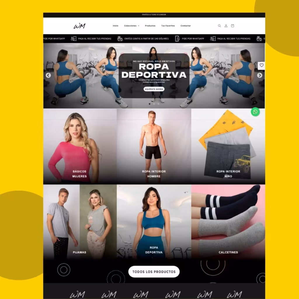 Moda WM es una tienda de ropa en Ecuador que ofrece desde ropa deportiva hasta lencería y pijamas. Como Alex Freelancer, desarrollé una tienda en Shopify donde la estética visual se une con la optimización técnica. Se trabajó en la limpieza de imágenes mediante IA y en una arquitectura de información que facilita al usuario encontrar lo que busca en segundos.