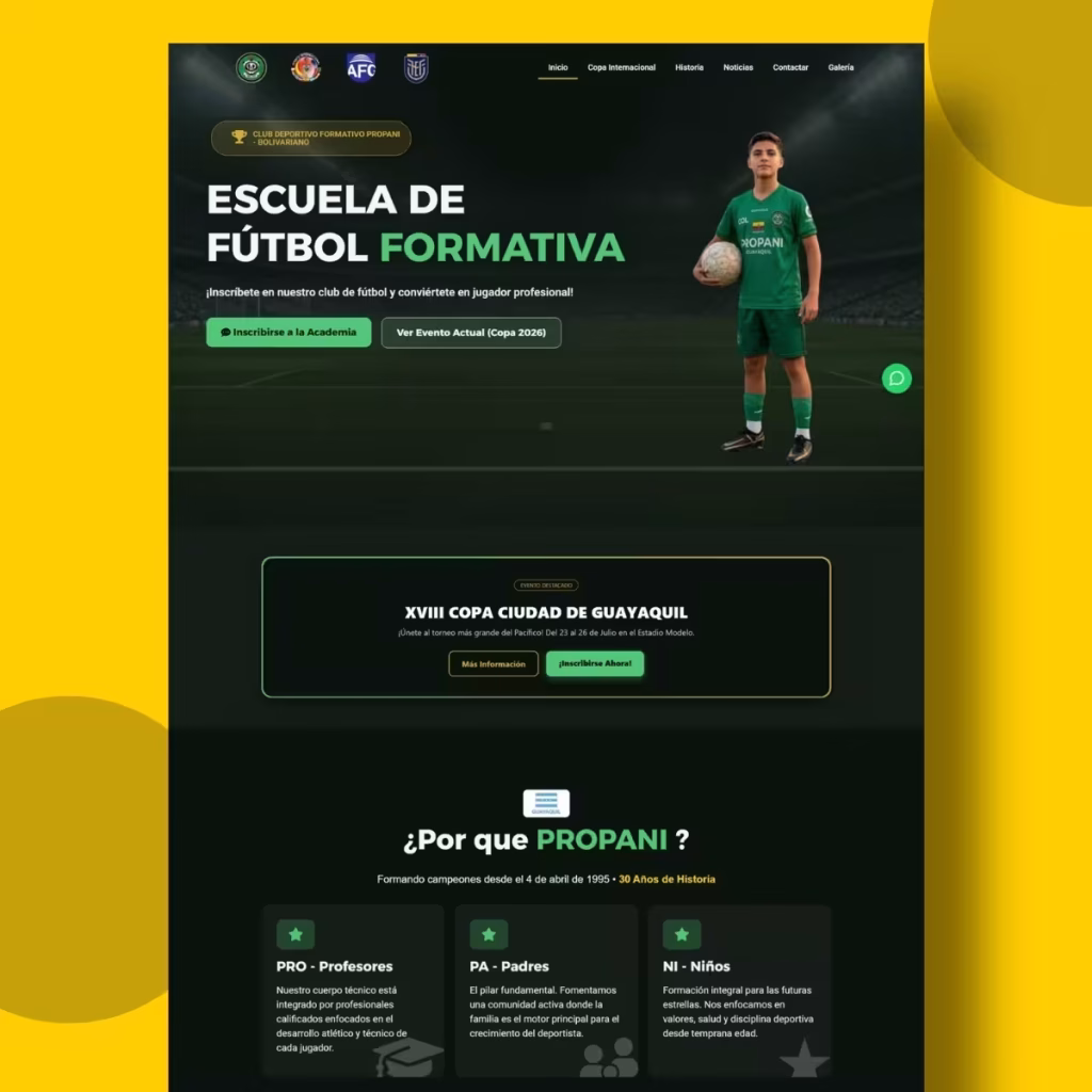 Como diseñador y estratega, desarrollé una plataforma que sirve como centro de noticias y captación. Durante el lanzamiento, el sitio web se convirtió en el canal oficial de la «Copa Ciudad de Guayaquil XVIII», un torneo que reúne a equipos nacionales e internacionales en las sedes de FEDEGUAYAS. El enfoque técnico permitió que la escuela no solo informara sobre el evento, sino que proyectara una imagen de excelencia organizativa que respalda su oferta educativa.